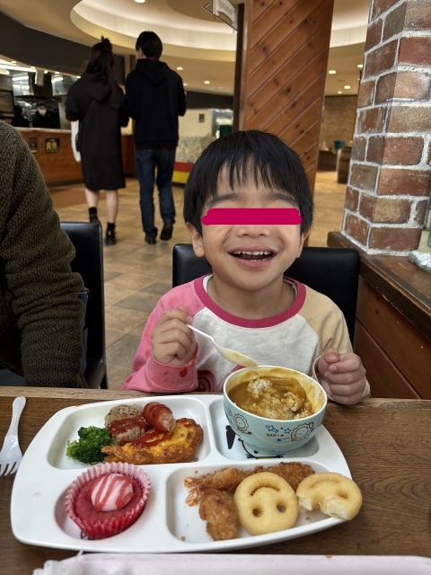大好きなカレーやエビフライ、から揚げ、ハンバーグ、にこにこポテトなど子どもが喜びそうなプレートに息子もご満悦!