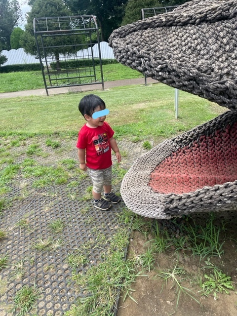 息子もこちらの遊具で少し遊んできました。一番の目玉はやはりトカゲのネット遊具ですね。スロープを登ると、トカゲのからだにそのまま入れます。出口はトカゲの口!!息子の身長(約85㎝)ほどであれば、かがむことなく立ったまま歩いて行けます。トカゲのからだはとてもしっかりとしたロープで作られていますので踏んでもたわむことなく、怖がらずに進むことができるかと思います。